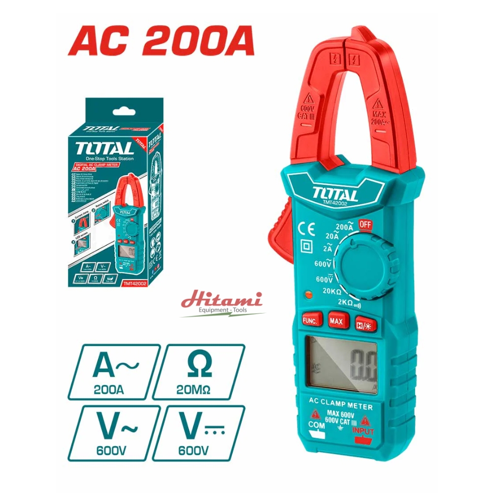 Ampe kìm đo dòng AC kỹ thuật số Total TMT42002 là một thiết bị đo lường chuyên nghiệp được thiết kế để đáp ứng nhu cầu đo dòng điện xoay chiều của các thợ điện và kỹ thuật viên. Với công nghệ số hiện đại và độ chính xác cao, sản phẩm này mang đến giải pháp đo lường tin cậy cho nhiều ứng dụng trong lĩnh vực điện. Thiết bị được trang bị màn hình hiển thị 2000 số đếm, cho phép đọc kết quả một cách rõ ràng và chính xác. Khả năng lưu trữ dữ liệu giúp người sử dụng theo dõi và ghi lại các phép đo quan trọng.