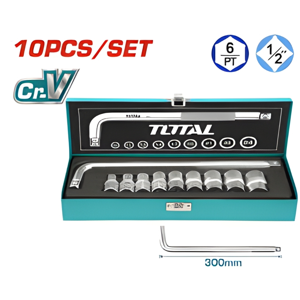 Bộ này bao gồm 9 đầu tuýp 1/2″ (10-24mm) và 1 tay cầm L 1/2″ 300mm. Tay cầm chữ L dài 300mm cung cấp đòn bẩy vượt trội. Các đầu tuýp bao gồm các kích thước thông dụng cho công việc tải nặng. Thiết kế của tay cầm L giúp truyền lực hiệu quả, giảm thiểu rủi ro làm hỏng đầu tuýp hoặc bu lông. Bộ sản phẩm được đóng gói bằng hộp kim loại, tăng cường khả năng bảo vệ và độ bền.