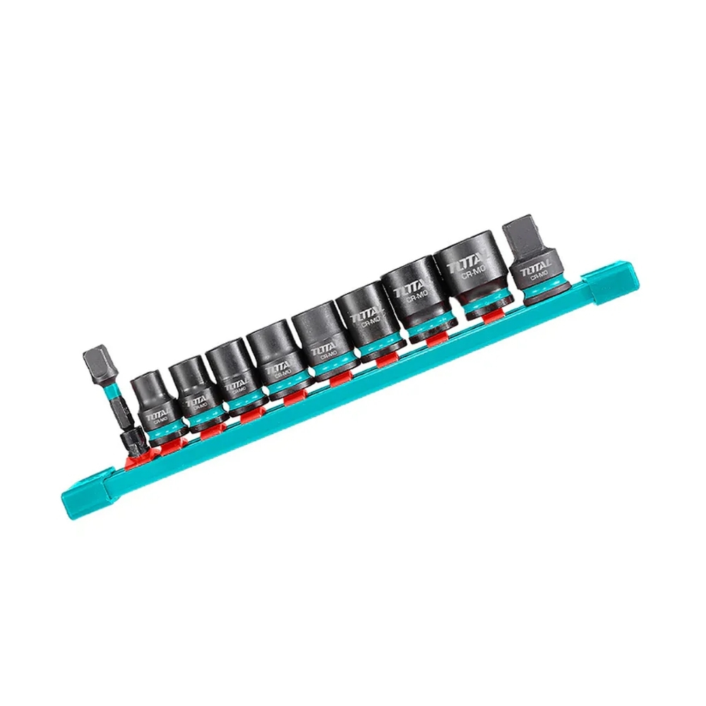 Bộ này bao gồm 8 đầu tuýp DR 3/8″” (8-19mm), 1 đầu tuýp chuyển đổi 3/8″(F) 1/2″(M) và 1 đầu tuýp chuyển đổi 1/4″ lục giác sang 3/8″. Đầu chuyển đổi lục giác 1/4″ cho phép sử dụng các mũi vít lục giác (bit) với khẩu 3/8″”. Thiết kế đa năng này giúp người dùng tận dụng tối đa máy khoan/siết bu lông hiện có. Các đầu tuýp được đặt trong khung nhựa, đóng gói trong vỉ đôi. Bộ này thích hợp cho các mẫu máy khoan/siết Total TDRLI206015.