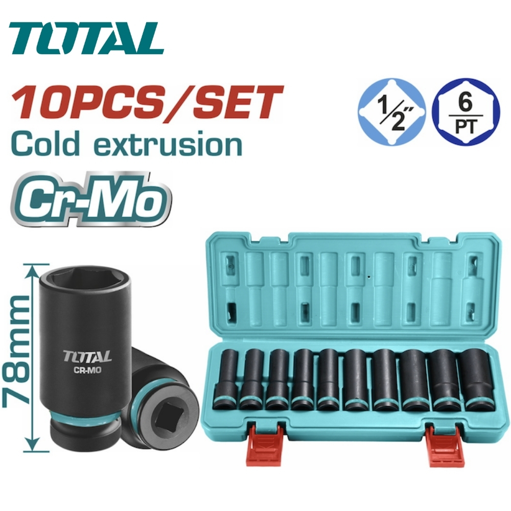Bộ 10 đầu tuýp Deep Impact DR 1/2″ Total THKISD12102L là bộ dụng cụ tuýp tác động sâu, cung cấp dải kích thước rộng hơn (lên đến 24mm) so với bộ 7 món cơ bản. Chiều dài 78mm của các đầu tuýp cho phép người dùng tiếp cận bu lông dài hoặc nằm sâu. Bộ sản phẩm này được làm từ thép CrMo và được chịu nhiệt để đảm bảo độ bền tối đa khi sử dụng với máy siết bu lông chịu lực.