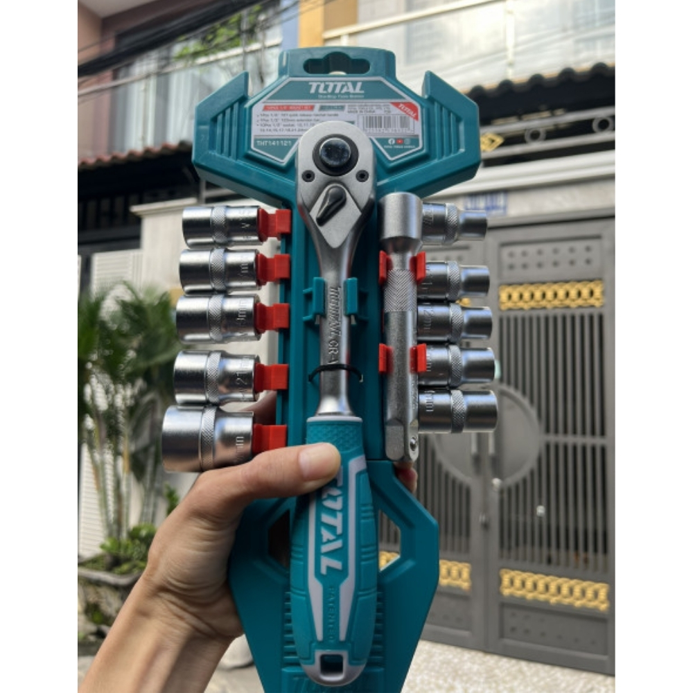 Bộ 12 đầu tuýp 3/8″ Total THT381121 là bộ dụng cụ cơ bản và thiết yếu với khẩu 3/8 inch, là kích thước trung bình lý tưởng cho các công việc sửa chữa ô tô, xe máy, và bảo trì máy móc. Các đầu tuýp được làm từ Thép Cr-V 50BV30 cao cấp, xử lý nhiệt và mạ Crom, đảm bảo độ cứng và khả năng chống gỉ sét. Bộ này cung cấp sự kết hợp giữa các đầu tuýp, tay vặn ratchet và thanh mở rộng, đáp ứng các nhu cầu siết/tháo bu lông/đai ốc thông thường.