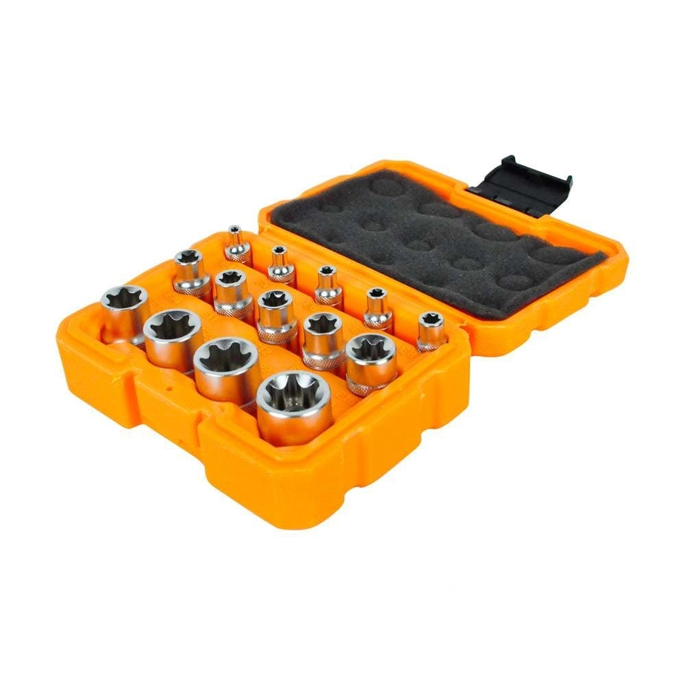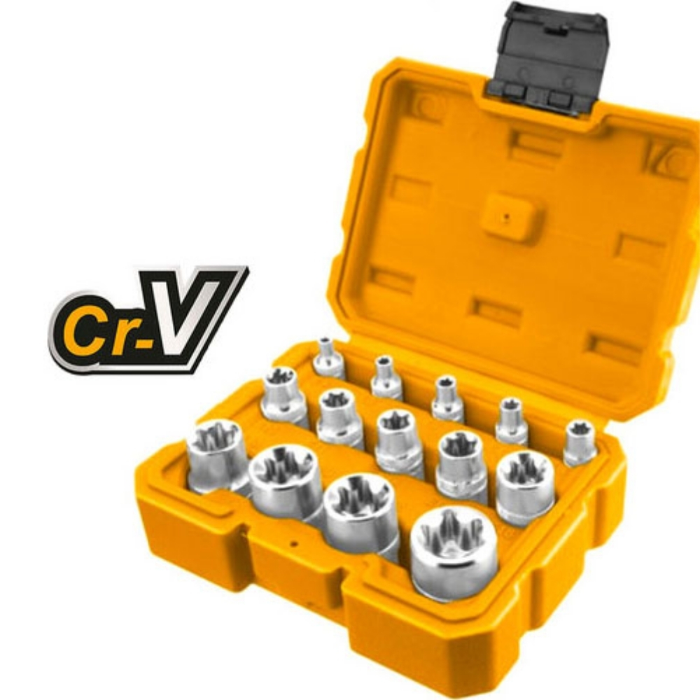 Bộ 14 đầu tuýp ngôi sao Ingco HKTETS0114 là bộ dụng cụ chuyên biệt dành cho các loại bu lông đầu hoa khế (E-Socket) thường thấy trên các dòng xe hơi hiện đại và máy móc đời mới. Bộ sản phẩm này cung cấp đầy đủ 3 loại đầu vuông phổ biến là 1/4 inch, 3/8 inch và 1/2 inch, mang lại sự linh hoạt tối đa khi kết hợp với các tay vặn tương ứng. Được làm từ thép CR-V chất lượng cao, các đầu tuýp có độ cứng cực tốt và khả năng bám khít vào đầu bu lông, tránh làm hỏng các cạnh ngôi sao nhạy cảm. Đây là bộ đồ nghề không thể thiếu trong tủ đồ của các kỹ thuật viên sửa chữa ô tô chuyên nghiệp.