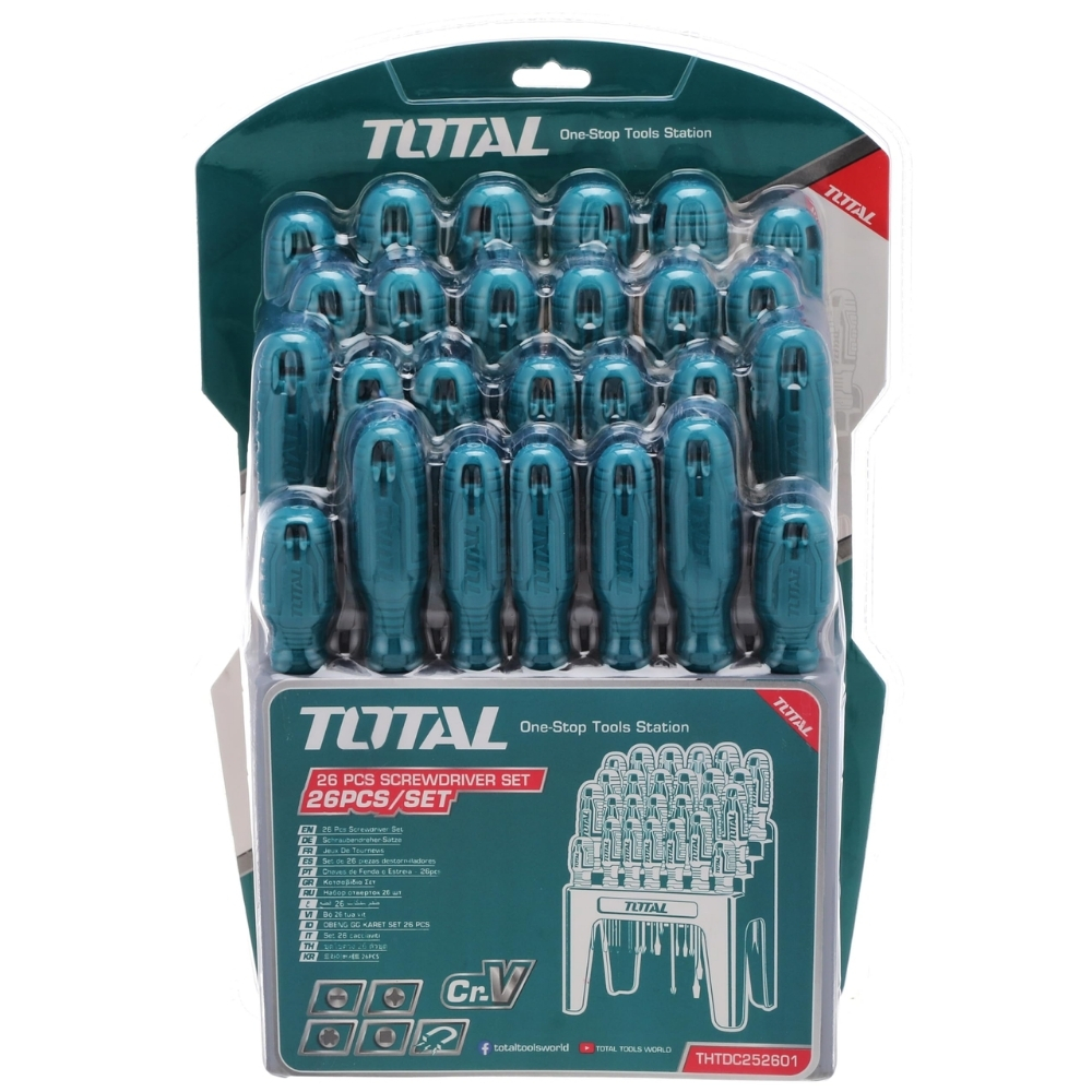 Bộ 26 tua vít Total THTDC252601 là bộ dụng cụ cầm tay chuyên nghiệp, cung cấp một sự đa dạng cực lớn về loại đầu (dẹp, bake, sao, vuông) và kích thước. Bộ sản phẩm này lý tưởng cho các thợ chuyên nghiệp làm việc trong môi trường đa ngành nghề, từ cơ khí, điện tử đến lắp đặt. Các tua vít có cán tròn và được làm từ chất liệu chất lượng cao, đảm bảo độ bền và hiệu suất siết vít tối ưu.