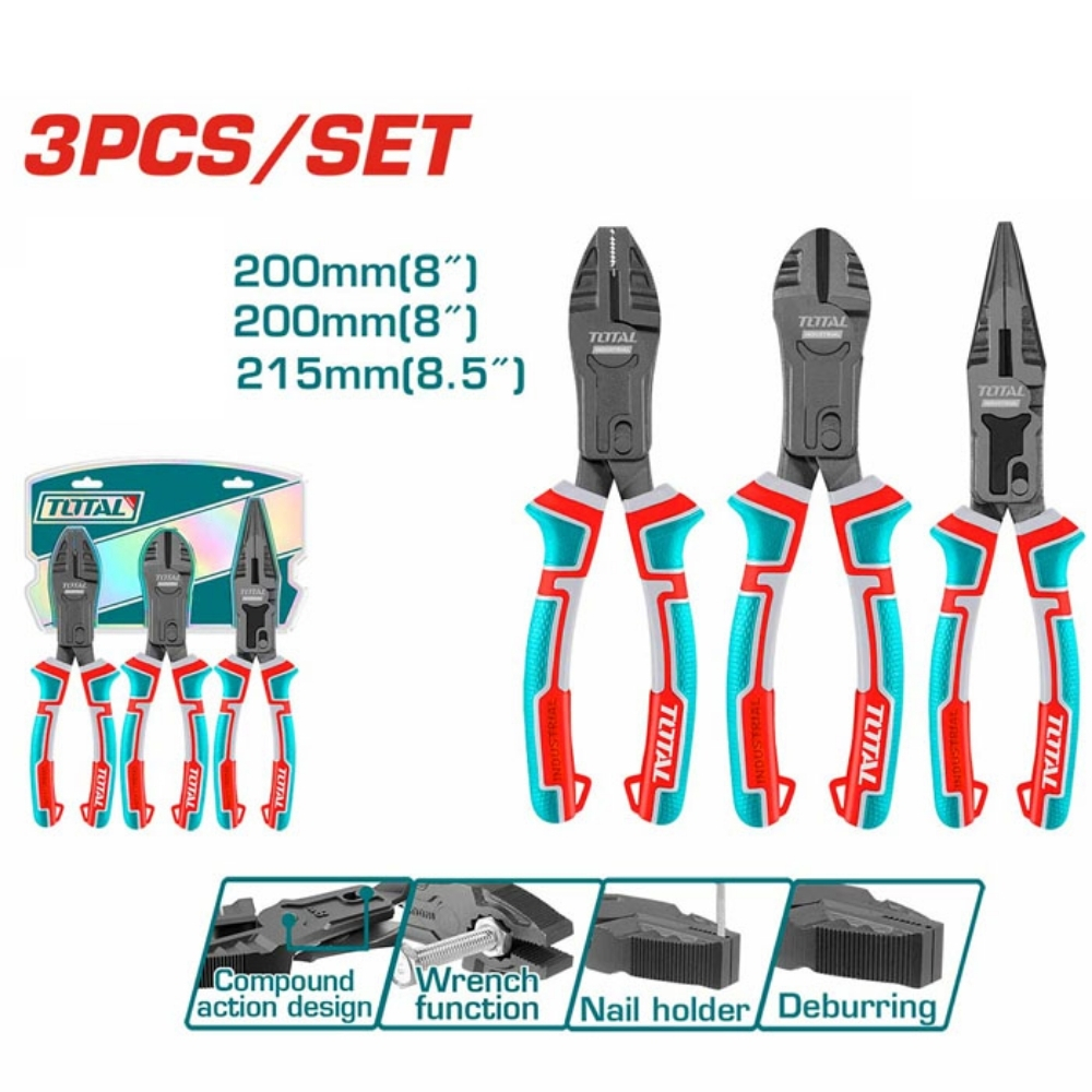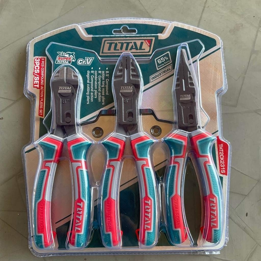 Bộ 3 kềm trợ lực Total THT2CK231S là bộ kềm chuyên nghiệp với khả năng tiết kiệm đến 65% sức lực so với kìm thông thường. Khả năng trợ lực này đạt được thông qua thiết kế cơ cấu đòn bẩy tiên tiến. Kềm được làm từ Cr-V và được phủ lớp Teflon trên bề mặt để chống gỉ sét và giảm ma sát. Tay cầm TPR ba màu mang lại độ bám chắc chắn.