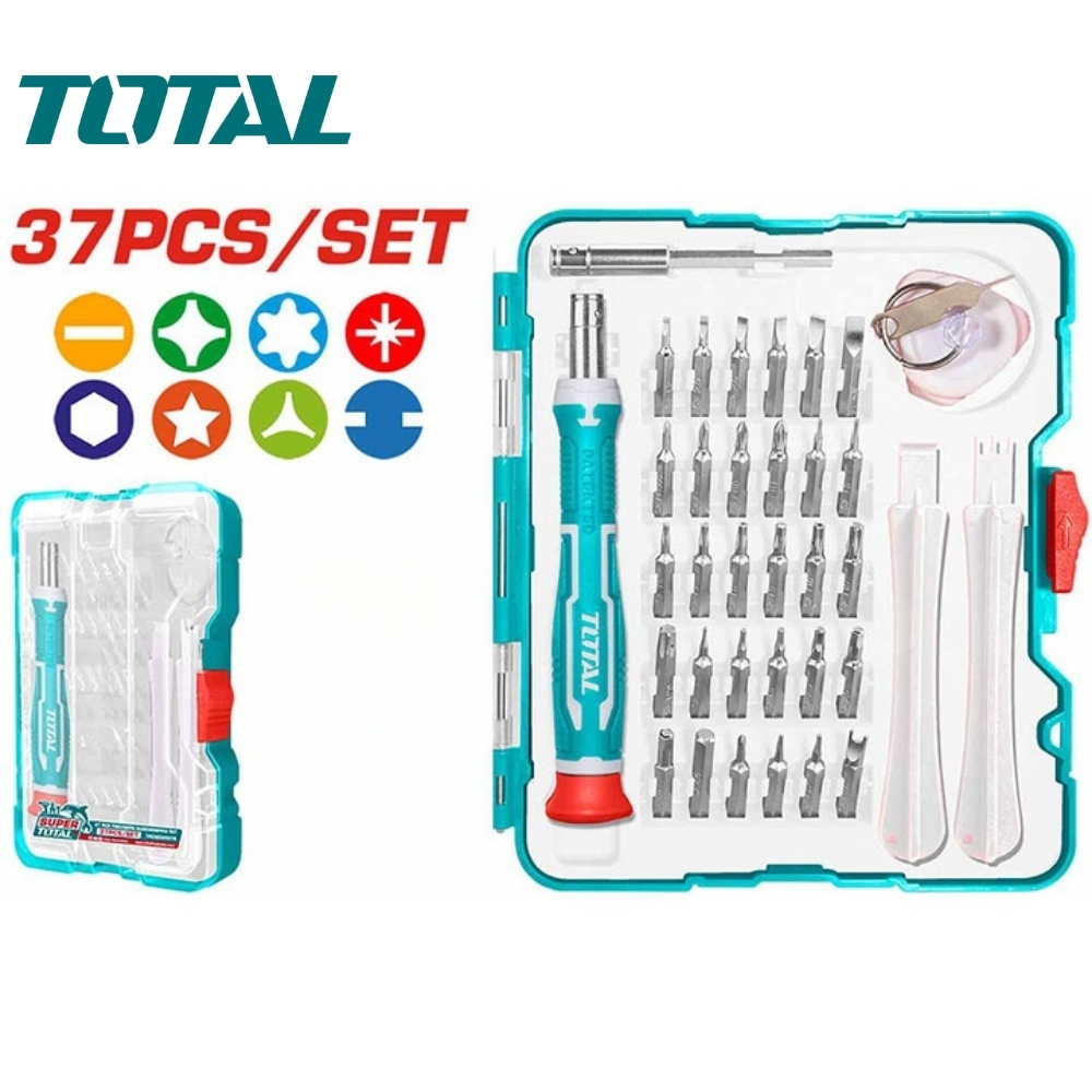 Bộ 37 tua vít chuẩn Total TACSD30376 là bộ dụng cụ chuyên nghiệp và toàn diện nhất cho sửa chữa thiết bị điện tử. Bộ sản phẩm này không chỉ cung cấp các mũi vít siêu nhỏ chuyên biệt mà còn đi kèm các công cụ hỗ trợ như ống hút, tam giác, thanh nạy nhựa và ty gài thẻ, cần thiết cho việc tháo lắp các thiết bị nhạy cảm như iPhone, iPad và máy tính xách tay. Đây là bộ dụng cụ lý tưởng cho các kỹ thuật viên sửa chữa điện tử.