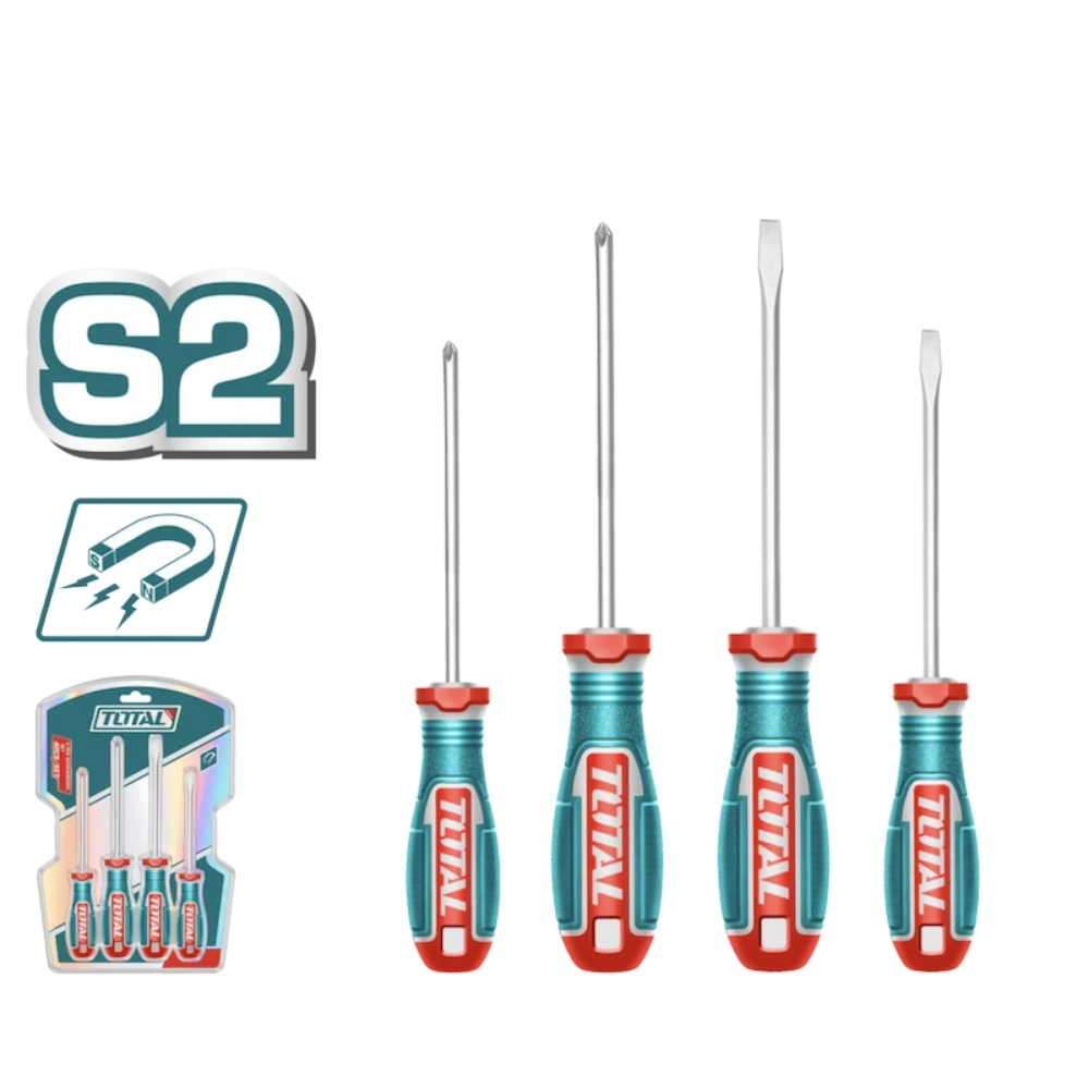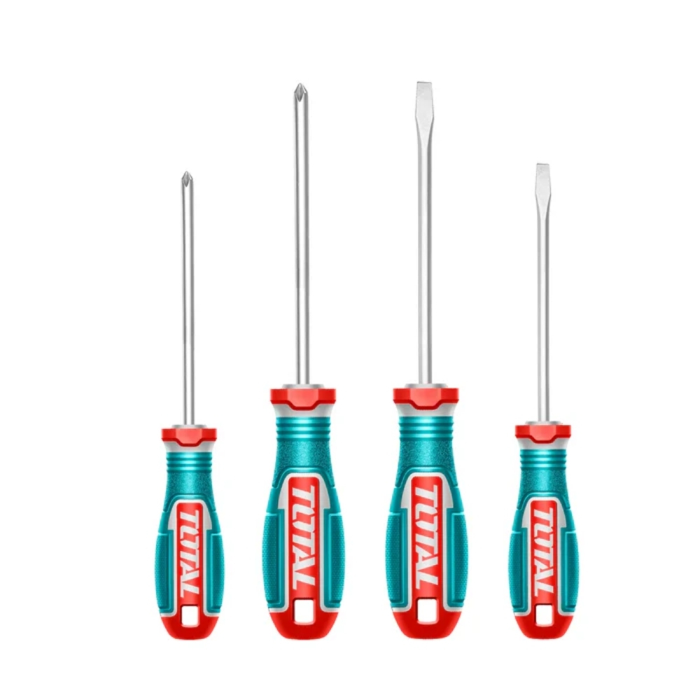 Bộ 4 tua vít Total TKSDS0426 là bộ dụng cụ cầm tay cơ bản và thiết yếu, bao gồm các kích thước tua vít dẹp (SL) và bake (PH) phổ biến nhất. Các tua vít được làm từ chất liệu S2 cao cấp, đảm bảo độ bền và khả năng chịu lực xoắn vượt trội. Thiết kế chuôi tròn và tay cầm 3 màu tiện dụng giúp người dùng cầm nắm thoải mái và tạo lực siết tối đa. Đây là bộ tua vít lý tưởng cho các công việc sửa chữa nhà cửa, điện tử và cơ khí nhẹ.