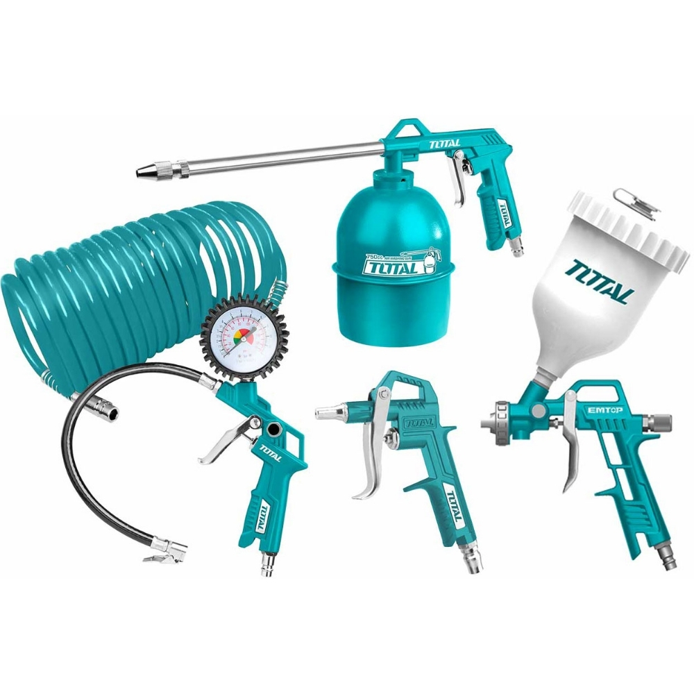 Total TATK053-3 bao gồm súng phun sơn với bình nhôm 600cc và áp suất hoạt động 3.0−4.0 bar, súng châm nhớt 750cc, súng bơm lốp với áp suất tối đa 12 bar, súng thổi khí và ống hơi 4m. Tất cả các công cụ chỉ sử dụng đầu nối loại Nitto tiêu chuẩn. Với ống hơi dài và đầy đủ các loại súng, bộ sản phẩm này đảm bảo công việc được thực hiện linh hoạt và hiệu quả cao. Bộ dụng cụ được đóng gói cẩn thận bằng hộp màu.