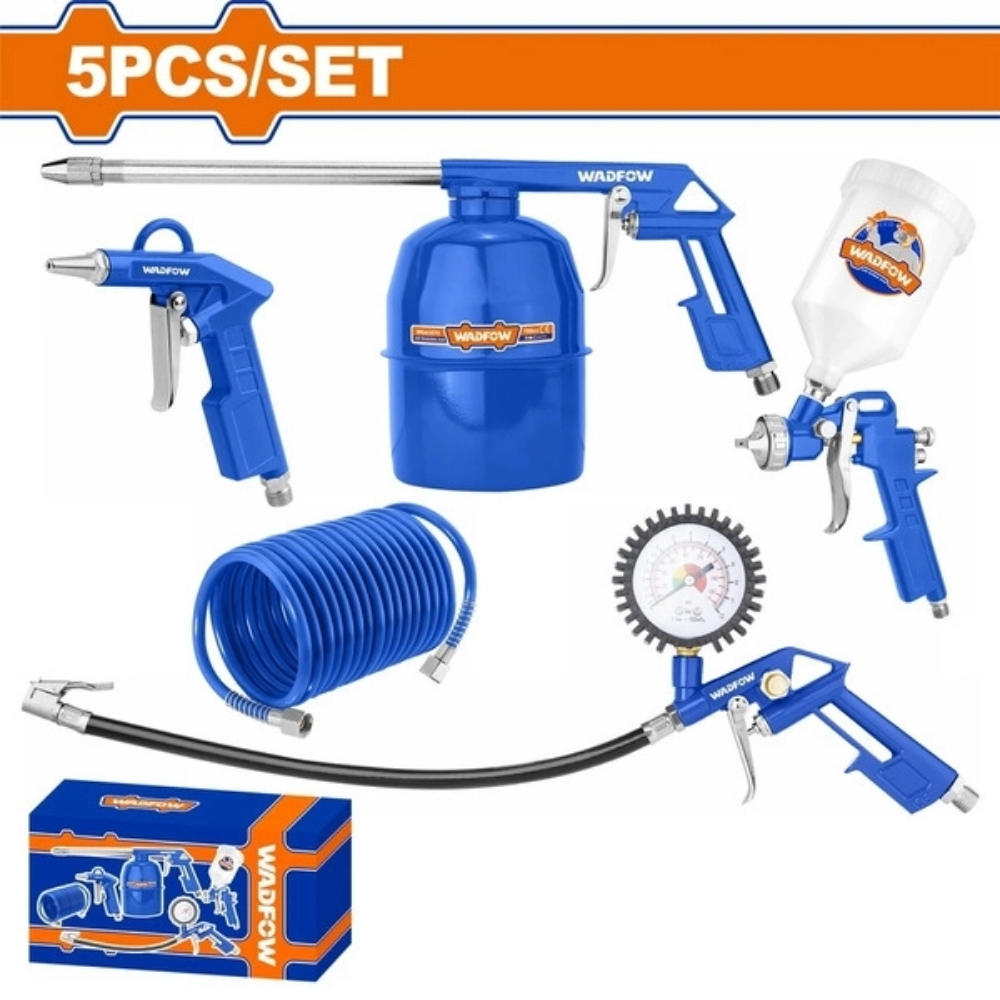 Bộ 5 dụng cụ dùng khí nén Wadfow WAX1505 là bộ công cụ đa năng, cung cấp đầy đủ các thiết bị cơ bản để thực hiện nhiều công việc khác nhau từ thổi bụi, phun sơn, xịt rửa, đến bơm lốp. Bộ sản phẩm bao gồm 5 thành phần thiết yếu: dây hơi xoắn, súng thổi khí, súng phun sơn, súng xịt rửa, và súng bơm lốp hơi, là sự khởi đầu hoàn hảo cho bất kỳ ai mới thiết lập hệ thống khí nén.