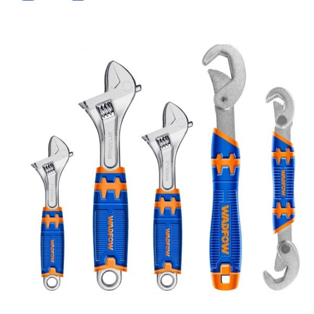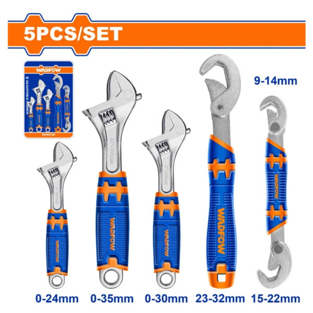 Bộ 5 mỏ lết Wadfow WAW275K bao gồm: 3 mỏ lết điều chỉnh (150mm/6″, 200mm/8″, 250mm/10″) với khả năng kẹp lần lượt lên đến 24mm, 30mm và 35mm; 1 cờ lê hai đầu miệng (9-14mm & 15-22mm) và 1 cờ lê một đầu miệng (23-32mm). Toàn bộ được rèn thả và xử lý nhiệt, đảm bảo độ cứng và độ bền.