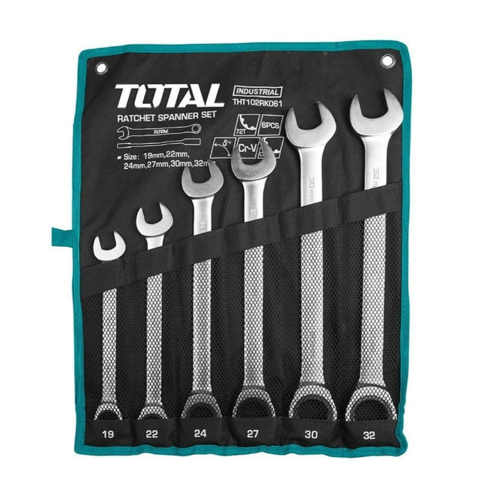 Bộ 6 cờ lê miệng vòng 2 chiều Total THT102RK061 là bộ cờ lê ratchet (có cóc) tải nặng, chuyên xử lý các bu lông/đai ốc lớn với dải kích thước từ 19mm đến 32mm. Thiết kế Ratchet 2 chiều mang lại tốc độ và sự tiện lợi ngay cả khi làm việc với các bu lông lớn. Bộ này lý tưởng cho các thợ cơ khí ô tô, xe tải và máy móc công nghiệp.