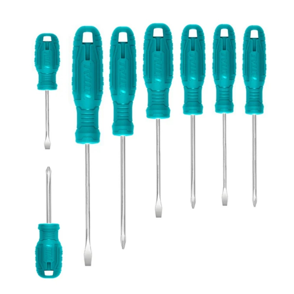 Bộ 8 tua vít Total THTDC250801 là bộ dụng cụ cầm tay toàn diện, bao gồm các kích thước dẹp (SL) và bake (PH) từ nhỏ đến lớn, kết hợp cả tua vít dài và tua vít lùn. Các tua vít được làm từ thép CR-V, cung cấp sự cân bằng tốt giữa độ bền và giá trị. Bộ sản phẩm này lý tưởng cho người dùng muốn có một bộ tua vít đa năng, đủ để xử lý hầu hết các công việc sửa chữa và lắp đặt thông thường