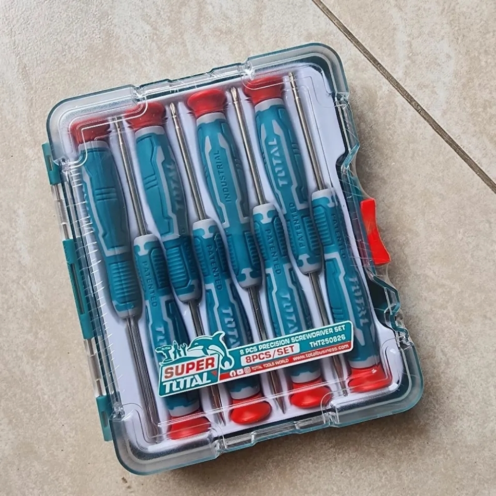 Bộ 8 tua vít Total THT250826 là bộ dụng cụ chuyên dụng cho sửa chữa thiết bị điện tử chính xác, còn được gọi là tua vít chuẩn (precision screwdrivers). Bộ sản phẩm này được thiết kế để xử lý các loại vít nhỏ trên điện thoại, máy tính, đồng hồ và các thiết bị điện tử khác. Các tua vít được làm từ chất liệu CR-V và có tay cầm thoải mái được thiết kế mới để tăng cường độ chính xác khi thao tác.