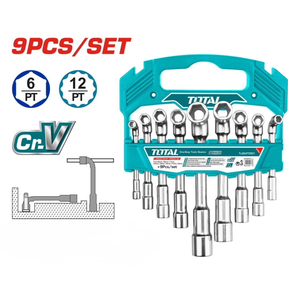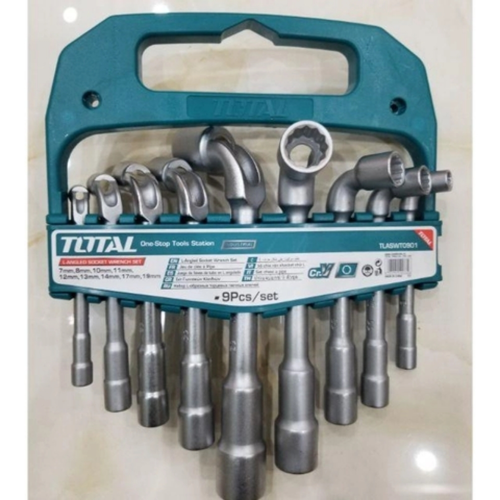 Bộ 9 chìa vặn góc L Total TLASWT0901 là bộ cờ lê vòng góc L mở rộng, cung cấp dải kích thước rộng hơn (lên đến 19mm) so với bộ 6 món cơ bản. Được làm từ thép Cr-V, bộ này có chất lượng và độ bền cao, đáp ứng các tiêu chuẩn khắt khe. Thiết kế góc L giúp người dùng dễ dàng siết/tháo bu lông nằm ở các vị trí chìm, sâu, hoặc đòi hỏi lực siết lớn mà vẫn cần sự khéo léo.