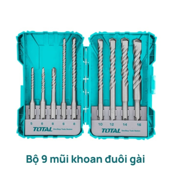 Bộ 9 mũi khoan gài Total TACSDL30901 là bộ dụng cụ chuyên dụng cho máy khoan búa, được thiết kế để khoan các vật liệu cứng như bê tông, gạch, và đá. Bộ sản phẩm này cung cấp sự kết hợp lý tưởng giữa các mũi khoan với đường kính và chiều dài khác nhau, đáp ứng nhu cầu khoan sâu và khoan xuyên vật liệu xây dựng. Thiết kế đầu gài (SDS Plus) giúp việc thay thế mũi khoan trở nên nhanh chóng và truyền lực tác động búa hiệu quả hơn.