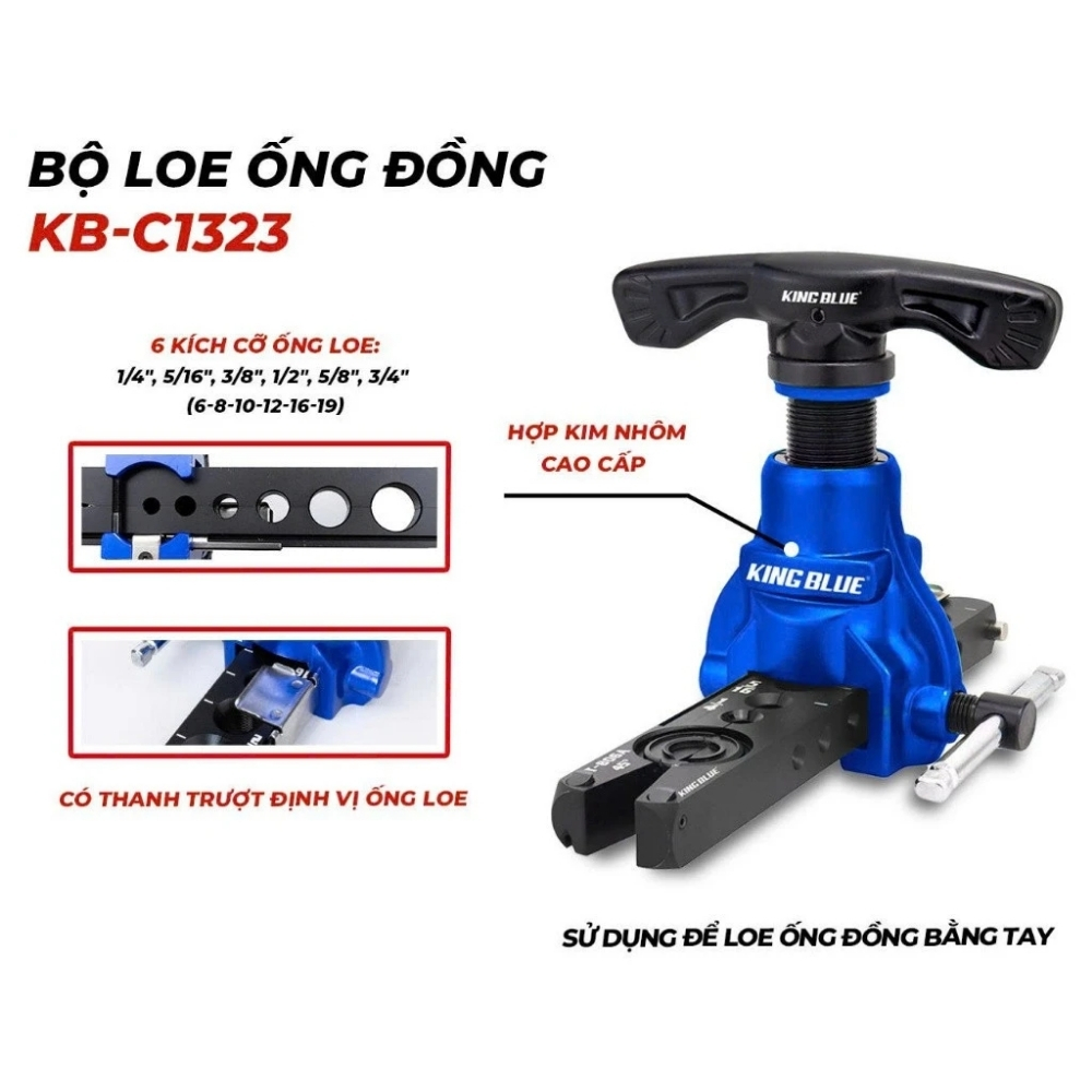 Bộ loe ống đồng King Blue KB-C1323 là công cụ hỗ trợ đắc lực cho kỹ thuật viên điện lạnh trong việc lắp đặt và sửa chữa đường ống. Với cấu tạo từ hợp kim nhôm chuyên dụng, bộ dụng cụ vừa đảm bảo độ cứng cáp để chịu lực ép, vừa có trọng lượng nhẹ giúp người thợ giảm mỏi tay khi làm việc liên tục hoặc trong không gian hẹp.
