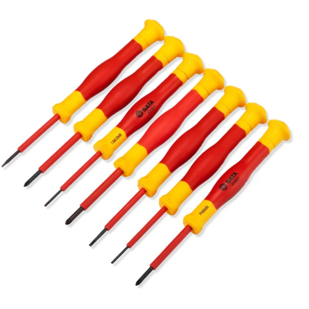 Bộ tua vít cách điện 1000V Sata 09318 gồm 7 chi tiết: 5 tua vít mũi dẹp (1.5x50mm đến 3.0x50mm) và 2 tua vít Phillips (PH0x50mm, PH00x50mm). Đạt tiêu chuẩn 1000V, an toàn khi làm việc với điện áp cao, lý tưởng cho thợ điện và sửa chữa thiết bị điện tử.