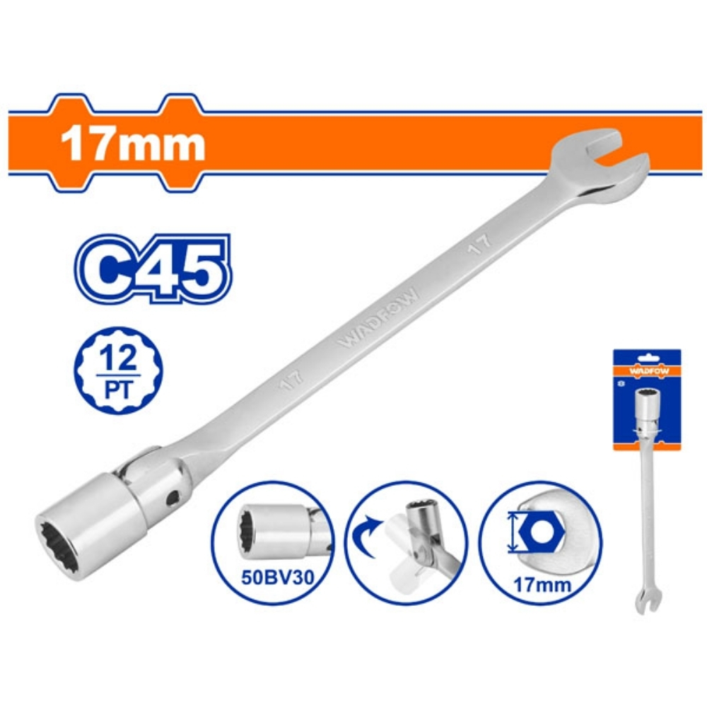 Cờ lê tuýp lắc léo được thiết kế với đầu tuýp gắn cố định nhưng có thể xoay, cho phép người dùng siết/nới bu lông/đai ốc nằm sâu hoặc ở góc nghiêng. Kích thước 17mm là phổ biến trong sửa chữa ô tô và xe máy. Cờ lê tuýp lắc léo Wadfow WTH1E17 có kích thước 17mm và chiều dài 233mm. Chất liệu đầu tuýp là 50BV30 (một loại Cr-V chất lượng cao), trong khi thân cờ lê là thép carbon 45# được xử lý nhiệt, mạ Chrome với bề mặt bóng mờ chống trượt.