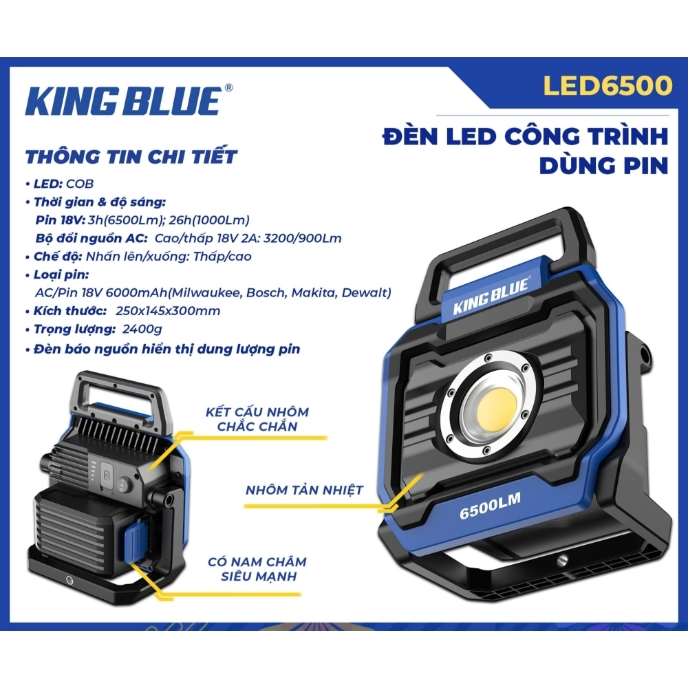Đèn Led công trình King Blue LED6500 được thiết kế để cung cấp nguồn ánh sáng mạnh mẽ và ổn định cho các khu vực thi công không có điện lưới hoặc cần tính cơ động cao. Với kích thước 250x145x300mm và trọng lượng 2.4kg, sản phẩm rất dễ dàng di chuyển và lắp đặt tại hiện trường. Điểm nhấn của model này chính là khả năng tối ưu hóa điện năng, giúp duy trì ánh sáng liên tục cho ca làm việc dài.