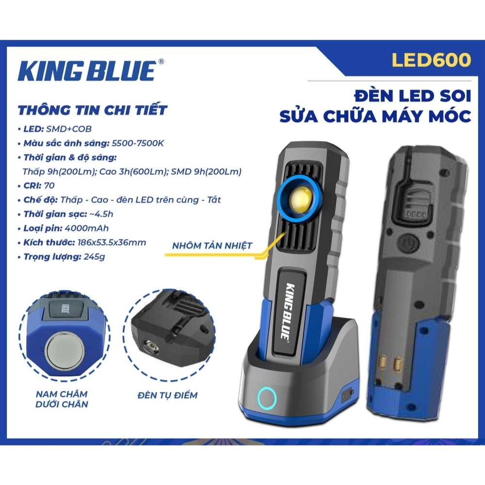 Đèn Led King Blue LED600 là công cụ chiếu sáng cầm tay chuyên dụng cho các công việc kiểm tra, sửa chữa trong không gian hẹp như khoang máy ô tô, dây chuyền sản xuất hoặc sử dụng trong gia đình khi mất điện. Với kích thước gọn gàng (186×53.5x36mm) và trọng lượng siêu nhẹ, người dùng có thể dễ dàng mang theo bên mình hoặc đặt vào các túi đồ nghề kỹ thuật mà không chiếm nhiều diện tích.