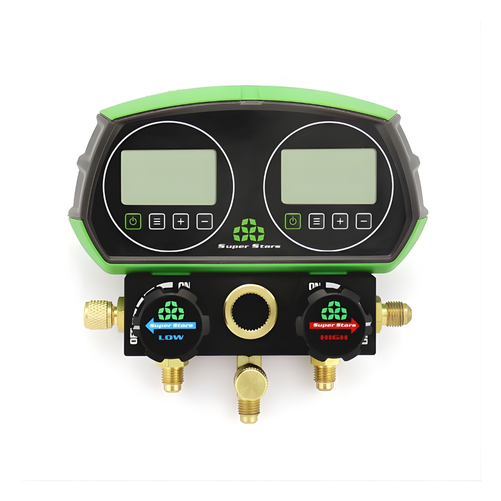 Đồng hồ đôi điện tử Super Star ST-B268D là bộ công cụ đo lường áp suất toàn diện cho kỹ thuật viên điện lạnh chuyên nghiệp. Sản phẩm kết hợp cả hai đồng hồ đo áp cao và áp thấp trên cùng một bộ van, giúp kiểm soát đồng thời toàn bộ chu trình nạp gas. Với khả năng tương thích hơn 90 loại gas lạnh, bộ thiết bị này thay thế hoàn toàn các loại đồng hồ cơ truyền thống cồng kềnh. Bộ sản phẩm đi kèm dây nạp gas dài 150cm, tạo nên một hệ thống kiểm soát môi chất lạnh hoàn hảo.