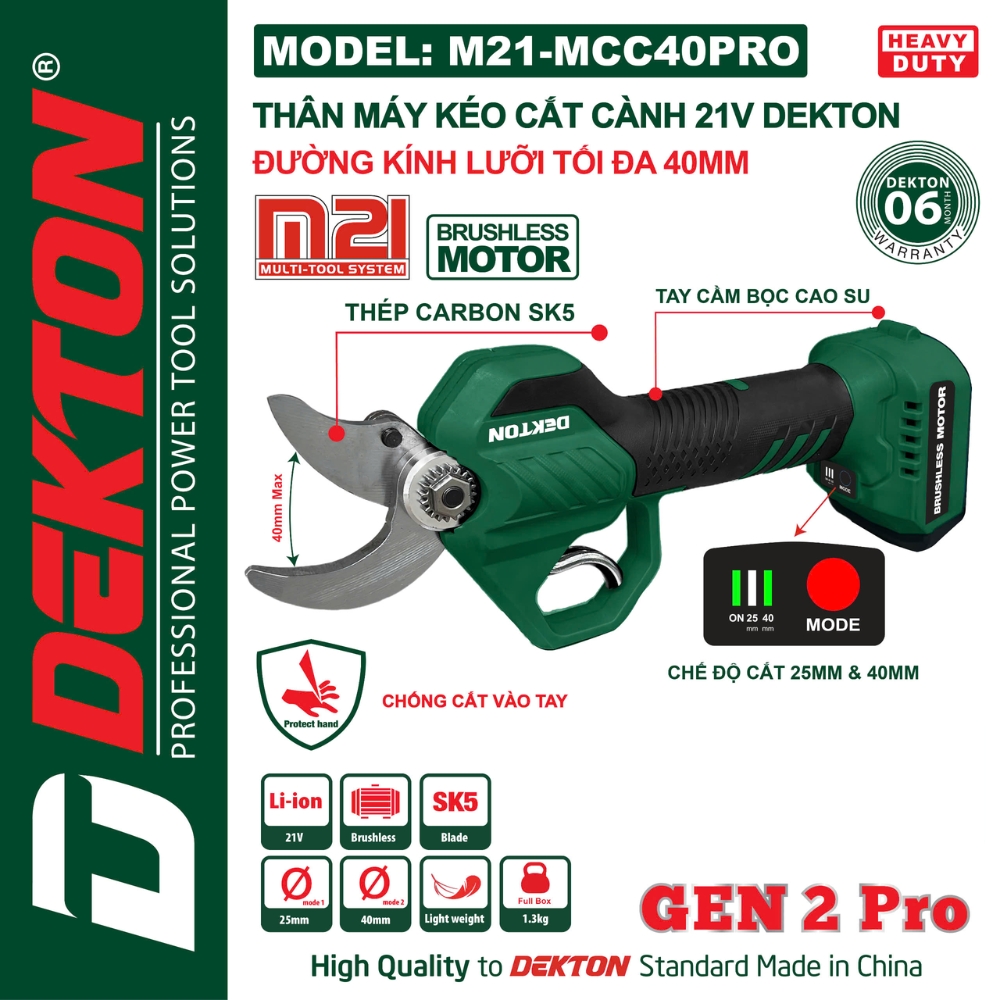 Kéo cắt cành dùng pin 21V 40mm Dekton M21-MCC40PRO là công cụ hỗ trợ đắc lực cho các công việc cắt tỉa cành cây chuyên nghiệp. Với thiết kế hiện đại và công nghệ tiên tiến, sản phẩm mang đến hiệu suất cắt vượt trội cùng độ bền cao. Động cơ brushless không chổi than giúp máy hoạt động êm ái, tiết kiệm năng lượng và có tuổi thọ sử dụng lâu dài. Bộ lưỡi cắt được chế tạo từ thép carbon SK5 cao cấp đảm bảo độ sắc bén và khả năng chịu mài mòn tốt.