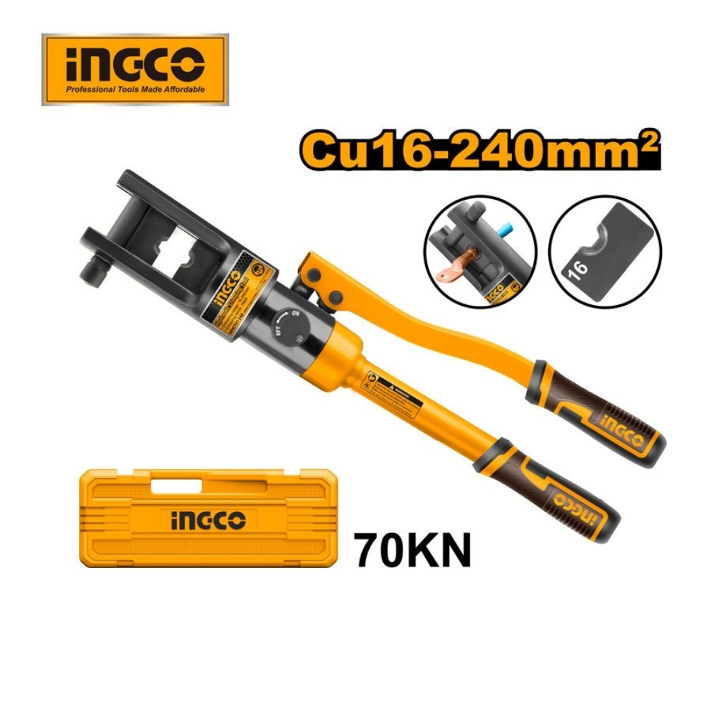 Kìm ép cốt thủy lực Ingco HHCT01240 là dòng thiết bị hạng nặng với khả năng ép các loại đầu cốt đồng có tiết diện lớn từ 16 đến 240mm². Được trang bị hệ thống thủy lực mạnh mẽ tạo ra lực ép lên đến 70KN, sản phẩm này xử lý dễ dàng các loại cáp điện trung thế và hạ thế trong công nghiệp nặng. Thiết kế của máy tập trung vào khả năng truyền tải áp lực cực đại một cách ổn định, giúp thợ điện hoàn thành các mối nối lớn chỉ trong thời gian ngắn mà không mất nhiều công sức. Đây là trang bị đạt chuẩn công nghiệp cho các đơn vị thi công điện cao thế, trạm biến áp và các nhà máy sản xuất quy mô lớn.