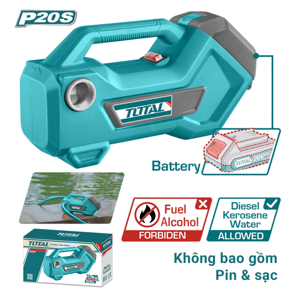 Máy bơm dầu diesel dùng pin Total model TTPLI2001 chuyên dùng để bơm nước, dầu hỏa và diesel ( không dùng bơm xăng, rượu) Điện thế pin sạc 20V, Tốc độ không tải: 4500rpm Dòng điện tối đa: 21A. Công suất:760gal/h.