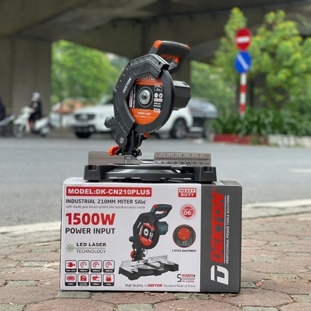 Máy cắt đa năng 210mm – 1500W Dekton DK-CN210PLUS hoạt động với Công suất 1500W và sử dụng Motor trực tiếp (chổi than). Điểm nổi bật là khả năng Cắt nghiêng 45 độ, giúp tạo ra các góc nối chính xác. Máy có thêm Đèn laser hỗ trợ căn chỉnh đường cắt (lưu ý: đèn không bảo hành) và kèm theo 1 lưỡi cắt đa năng khi mua. Sản phẩm có màu xám, mang lại vẻ ngoài hiện đại và chuyên nghiệp.