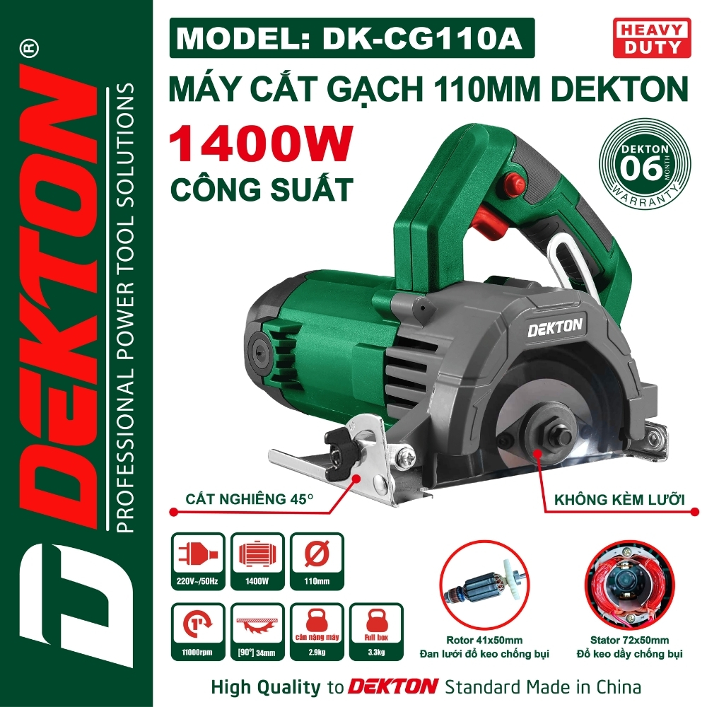 Động cơ của máy cắt gạch Dekton DK-CG110A có công suất mạnh mẽ lên đến 1400W, sử dụng 100% dây đồng bền bỉ, mang đến hiệu suất làm việc vượt trội. Với tốc độ quay 11000 vòng/phút, máy giúp cắt gạch, đá một cách nhanh chóng và chính xác. Roto đan lưới và phủ keo cách điện chống bụi giúp bảo vệ động cơ tốt hơn, tăng tuổi thọ cho máy.