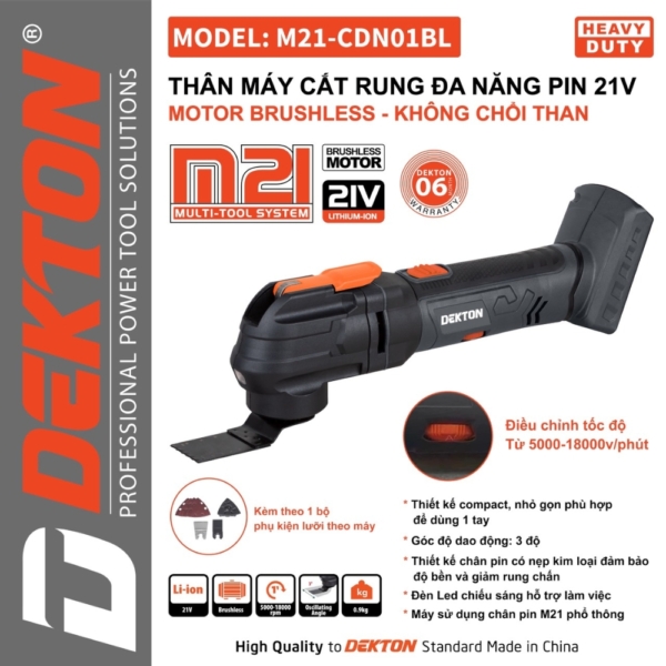 Máy cắt gọc dùng pin 21V Dekton M21-CDN01BL là công cụ đa năng được thiết kế nhỏ gọn, phù hợp cho các công việc cắt, mài và đánh bóng trong không gian hẹp. Với thiết kế một tay tiện lợi, sản phẩm này mang đến sự linh hoạt cao cho người sử dụng khi thực hiện các tác vụ chính xác. Motor brushless không chổi than đảm bảo hiệu suất ổn định và tuổi thọ cao, trong khi hệ thống điều chỉnh tốc độ từ 5000-18000rpm cho phép tùy chỉnh phù hợp với từng loại vật liệu và công việc cụ thể.