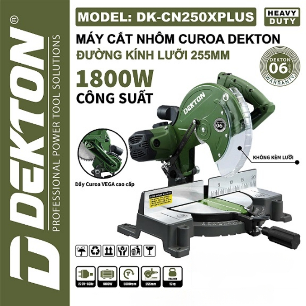 Máy Cắt Nhôm – Cắt Gỗ 255MM-Curoa Dekton DK-CN250XPLUS là máy cắt curoa ổn định, màu olive. Các thông số kỹ thuật chính bao gồm: