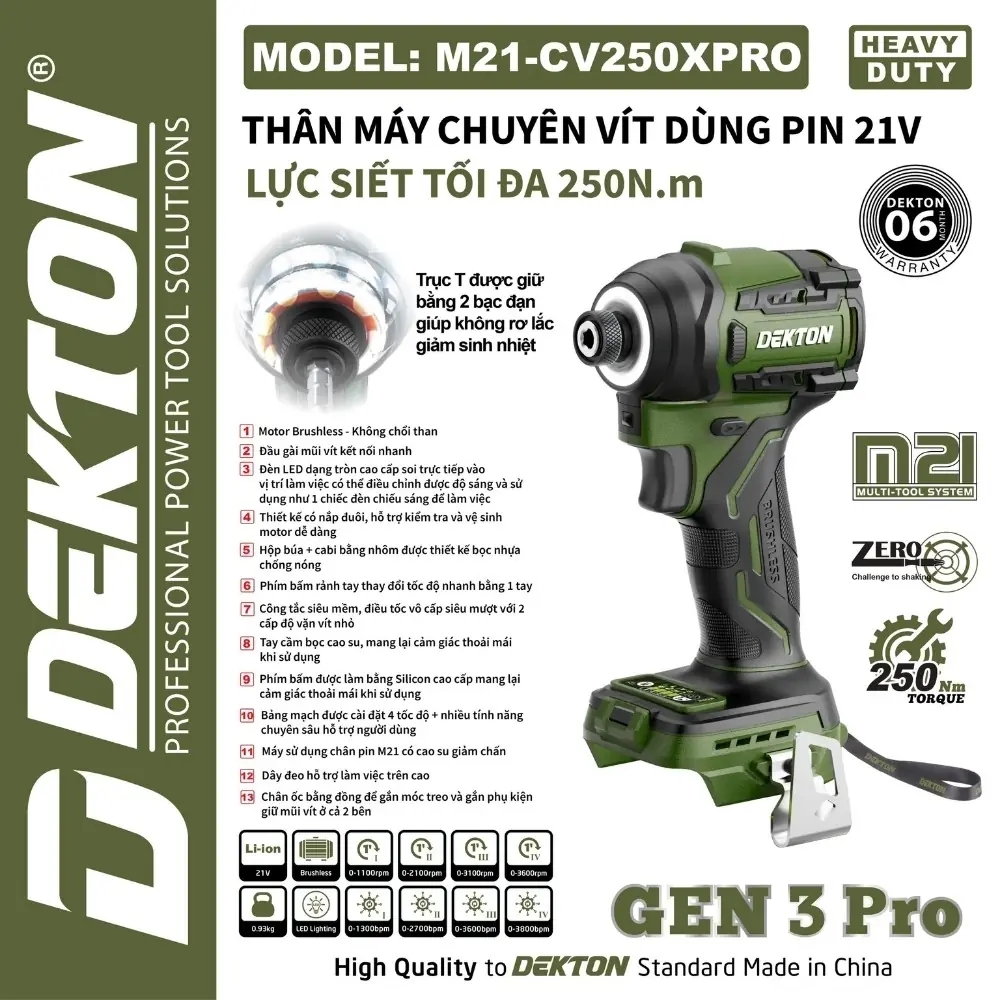 Thân Chuyên Vít 250N.M Dekton M21-CV250XPRO là máy chuyên vít cơ bản, cung cấp lực siết 250 N.m cho các công việc lắp đặt và sửa chữa hàng ngày. Máy được trang bị đèn tròn và hỗ trợ full chức năng cần thiết để thực hiện các công việc như bắn tôn, khoan khoét gỗ nhẹ, và siết mở các loại bulong nhỏ.