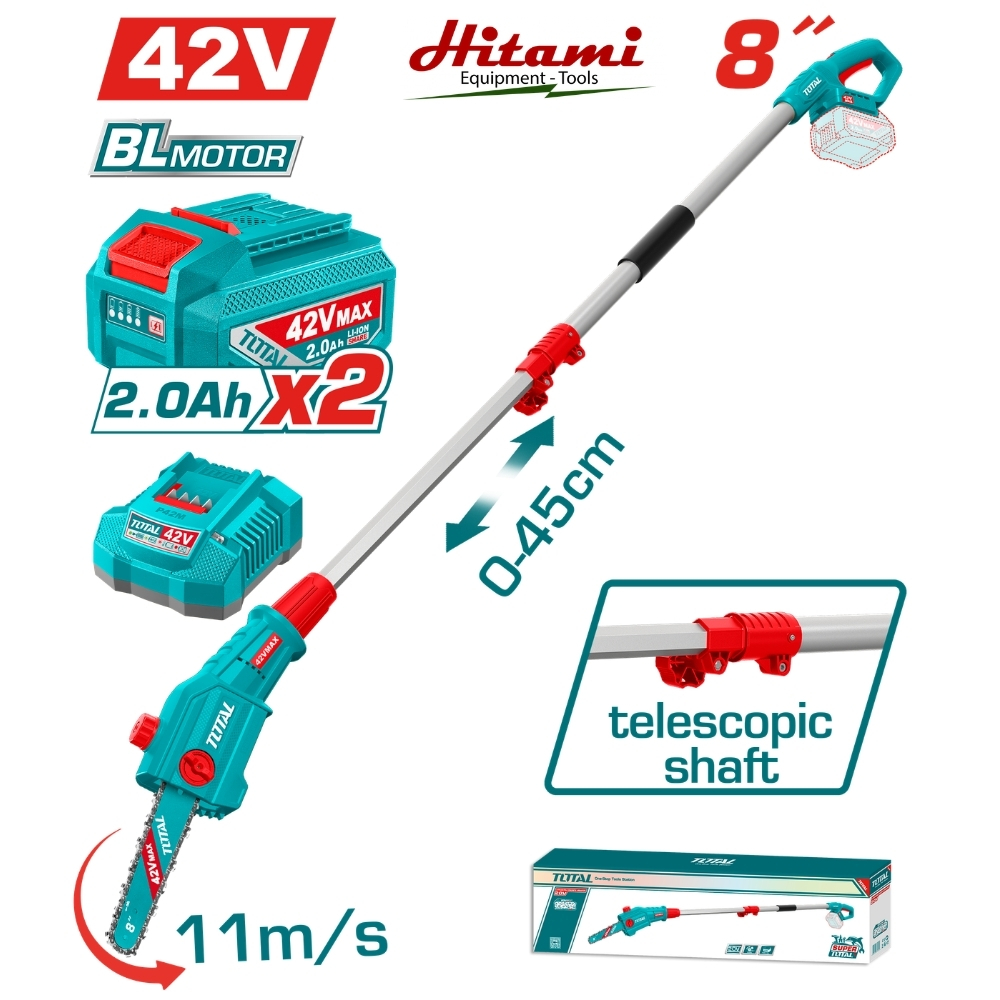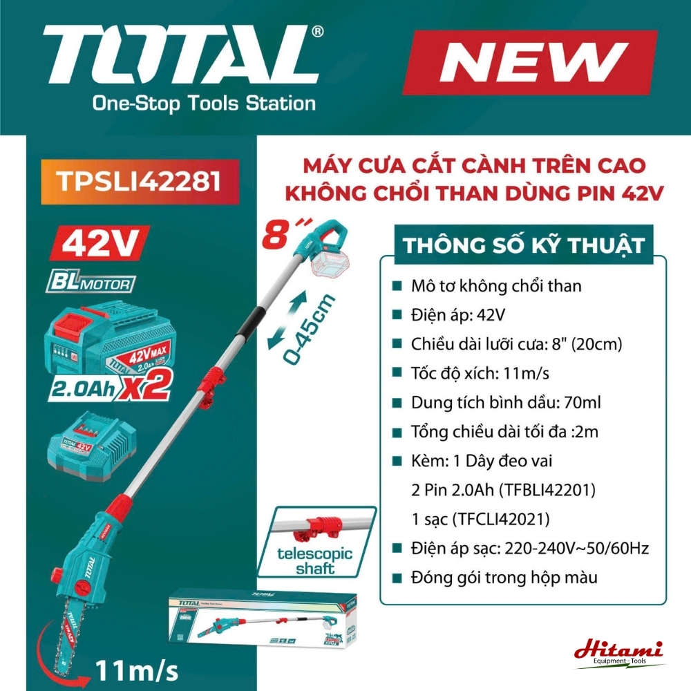 Total TPSLI42281 là giải pháp hoàn hảo cho việc chăm sóc cây cảnh và cắt tỉa cành cây ở vị trí trên cao mà không cần dùng thang. Với điện áp mạnh mẽ lên đến 42V và thiết kế cán dài tối đa 2m, thiết bị mang lại sự an toàn và tiện lợi tuyệt đối. Sản phẩm thuộc phân khúc chuyên nghiệp, giúp người dùng tiết kiệm công sức và thời gian tối đa trong việc duy trì cảnh quan sân vườn hoặc khu công viên.