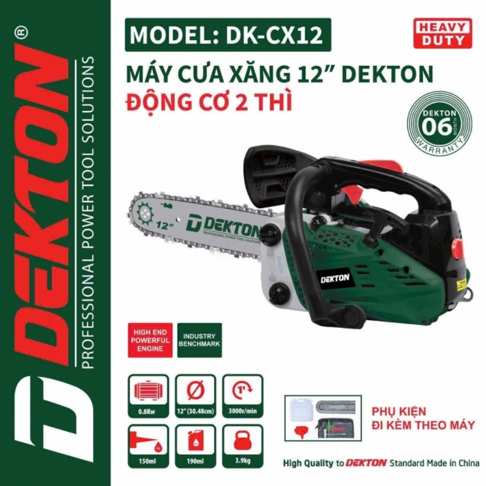 Cưa Xăng Pha Nhớt Dekton DK-CX12 là dòng cưa xích chạy xăng mạnh mẽ, được thiết kế để xử lý các công việc cắt tỉa cây, xẻ gỗ hoặc khai thác gỗ quy mô nhỏ. Sản phẩm sử dụng nhiên liệu xăng pha nhớt, mang lại sự cơ động và công suất lớn, lý tưởng cho những nơi không có nguồn điện. Đây là công cụ thiết yếu cho người làm vườn chuyên nghiệp và thợ lâm nghiệp.