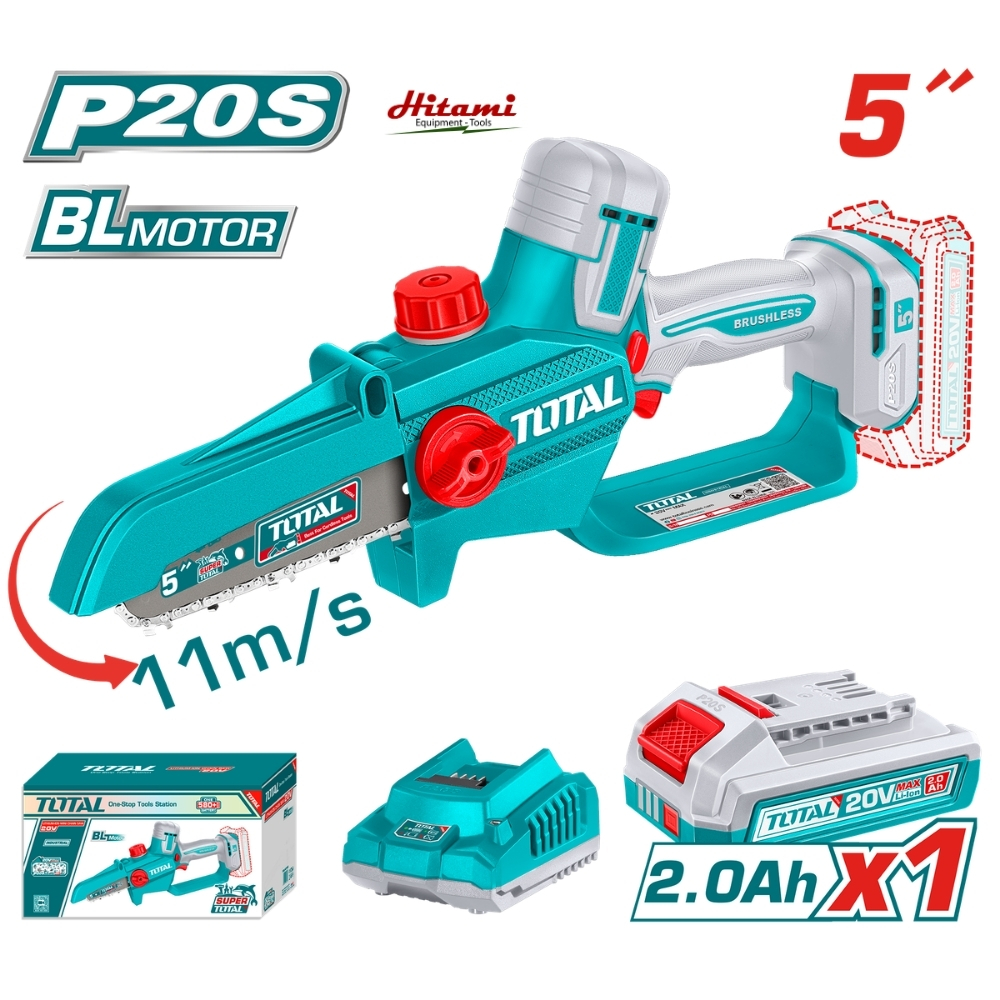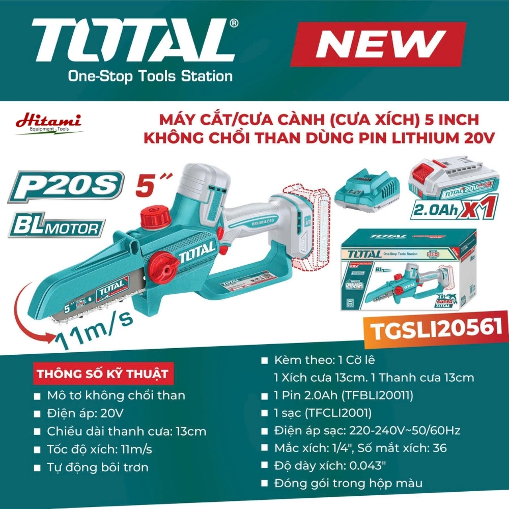 Total TGSLI20561 là phiên bản trọn bộ (kèm pin và sạc) của dòng máy cưa xích cầm tay 5 inch từ thương hiệu Total. Sản phẩm được thiết kế chuyên dụng cho việc chăm sóc cây cảnh, cắt tỉa cành khô hoặc xử lý gỗ nhỏ. Với sự kết hợp giữa công nghệ mô tơ Brushless và hệ pin 20V, máy cung cấp lực cắt mạnh mẽ trong một thân máy nhỏ gọn, cơ động.