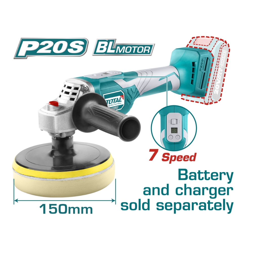Máy đánh bóng dùng pin Total động cơ chổi than, Tốc độ không tải: 500-2800/p, Đế dưới: 150mm, Màn hình LCD hiển thị và điều chỉnh tốc độ.