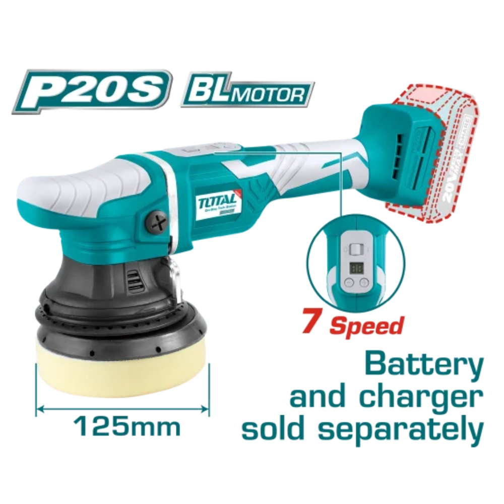 Máy đánh bóng không chổi than dùng pin total Điện thế: 20V, Tốc độ không tải: 2000- 4800 rmp, Đường kính đế mài: 125mm