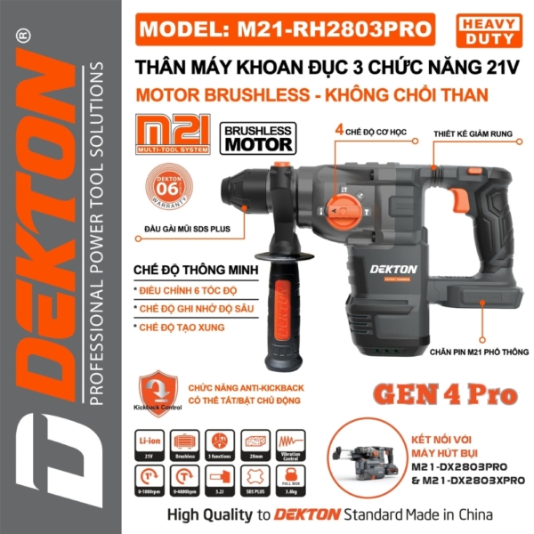 Máy khoan bê tông 3 chức năng pin Dekton M21-RH2803PRO là sự kết hợp hoàn hảo giữa công nghệ hiện đại và thiết kế tối ưu, mang lại hiệu suất cao và nhiều tính năng hỗ trợ công việc.