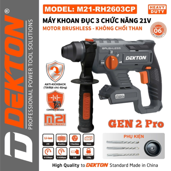 Máy khoan bê tông pin 3 chức năng Dekton M21-RH2603CP sở hữu những thông số và tính năng cốt lõi sau: