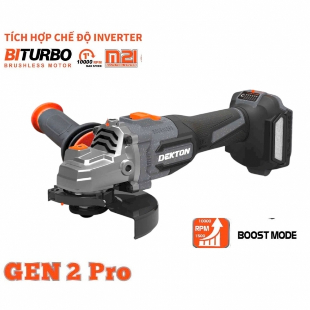 Máy mài góc dùng pin 100mm Dekton M21-AG100PROMAX là dòng máy mài góc cao cấp, tích hợp đầy đủ các tính năng an toàn hàng đầu và công nghệ động cơ BRUSHLESS (không chổi than) hiện đại. Sản phẩm được thiết kế để tối đa hóa hiệu suất và độ bền, phù hợp với các công việc mài, cắt kim loại, gạch, đá đòi hỏi sự chính xác và an toàn tuyệt đối. Điểm đặc biệt của máy là việc trang bị một loạt các chức năng bảo vệ người dùng và thiết bị như chống đá ngược, phanh đĩa nhanh và chống khởi động lại. Với khả năng điều chỉnh tốc độ linh hoạt và đế cắt đẩy tiện lợi, M21-AG100PROMAX là công cụ đa năng không thể thiếu trong các xưởng cơ khí, công trình xây dựng.