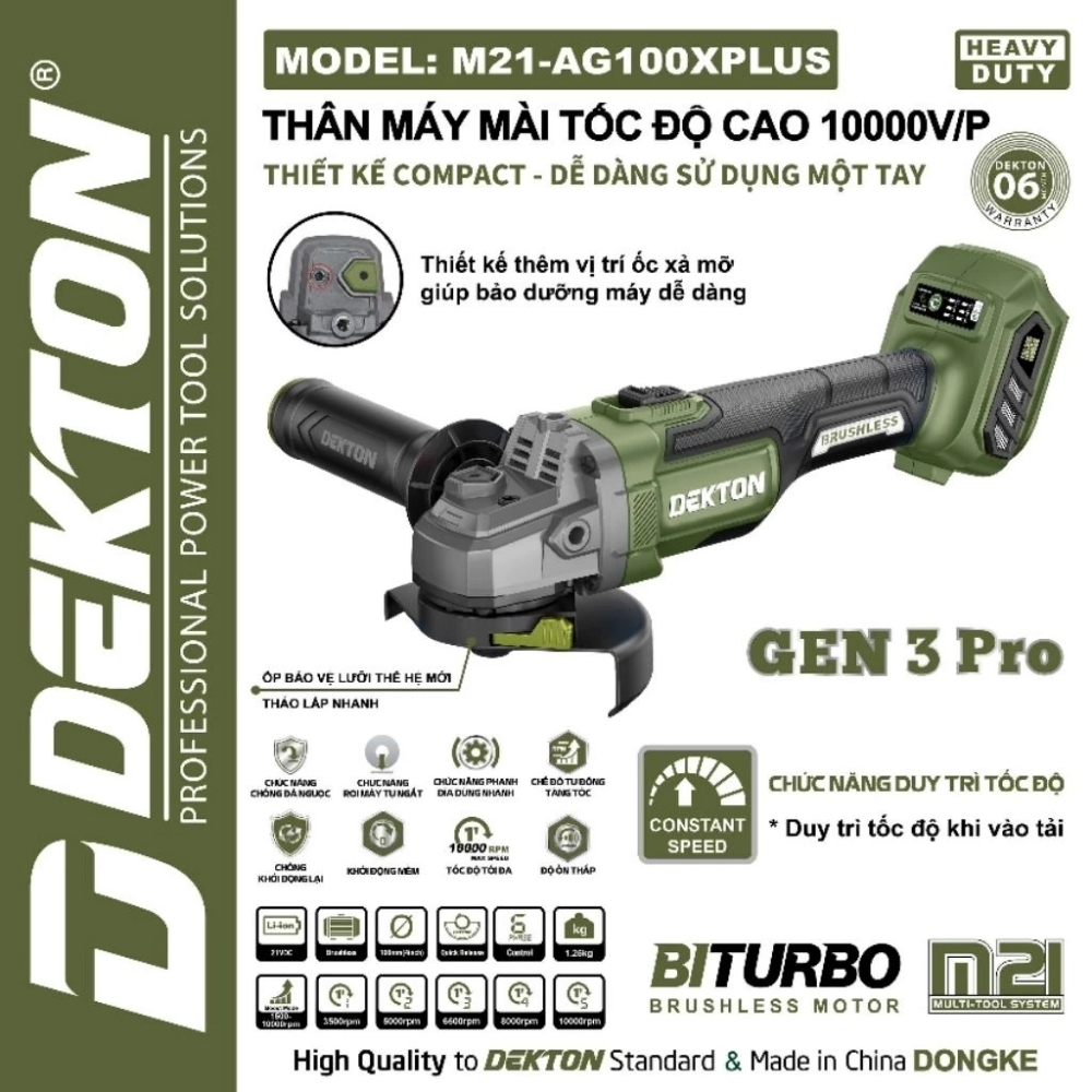 Máy mài góc dùng pin 21V – 100mm Dekton M21-AG100XPLUS là dòng máy mài góc không chổi than (BRUSHLESS), được thiết kế với ưu điểm là tính năng an toàn vượt trội và khả năng tùy chỉnh tốc độ cao. Sản phẩm sử dụng chân pin phổ thông, tạo sự thuận tiện tối đa cho người dùng đã sở hữu hệ thống pin 21V. Máy đáp ứng mọi nhu cầu mài, cắt vật liệu kim loại, gỗ, đá một cách nhanh chóng và chính xác. Sự tích hợp đầy đủ các tính năng bảo vệ người dùng như Phanh đĩa nhanh và Chống đá ngược giúp máy trở thành công cụ đáng tin cậy cho cả thợ chuyên nghiệp và người dùng gia đình.