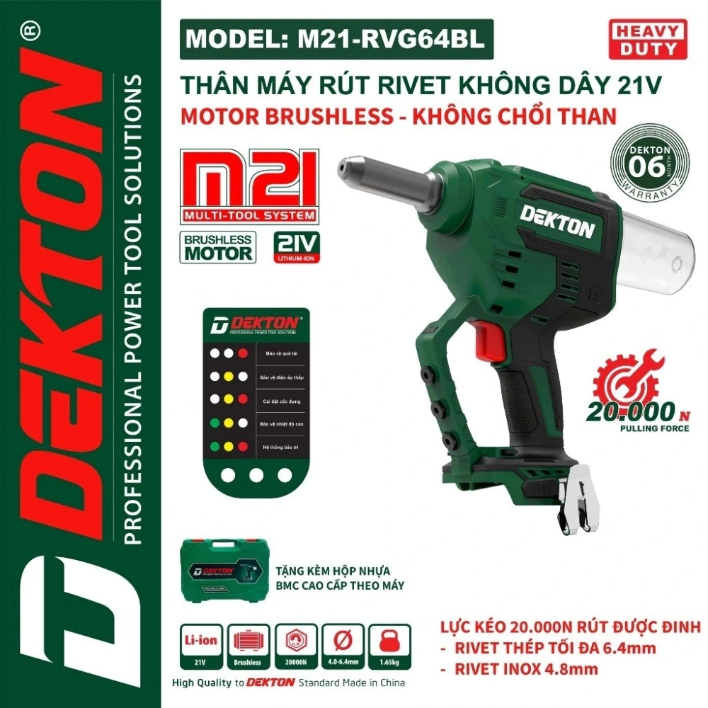 Máy Rút Rivet 21V Dekton M21-RVG64BL là công cụ rút đinh tán (rivet) chuyên nghiệp dùng pin, được thiết kế để tăng tốc độ và hiệu suất công việc lắp đặt và chế tạo kim loại. Máy được trang bị Motor BRUSHLESS (không chổi than) mạnh mẽ, đảm bảo lực kéo ổn định và tuổi thọ động cơ dài. Với lực kéo ấn tượng 20000N, máy có thể xử lý các loại đinh rivet lớn, đặc biệt là đinh thép 6.4MM và đinh inox 4.8MM.
