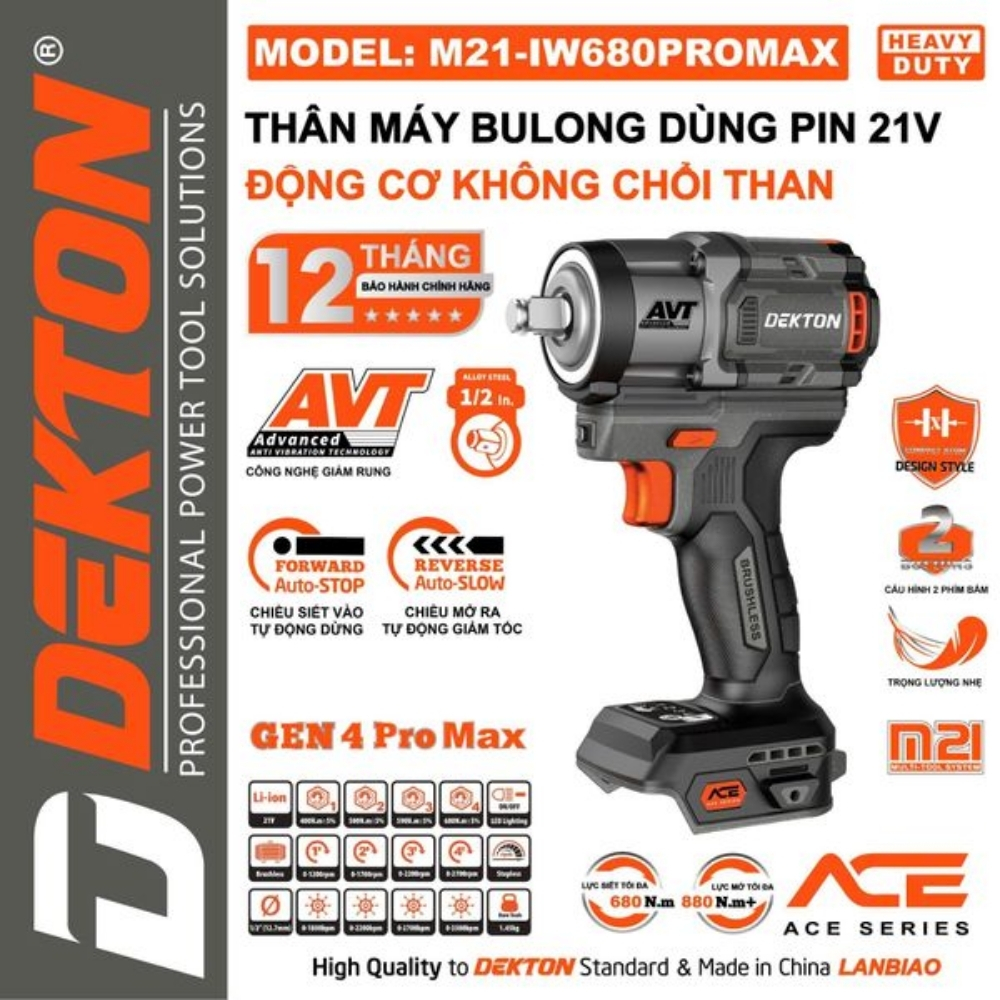 Máy Bulong Pin 21V Dekton M21-IW680 PROMAX là máy lực siết cao, có nhiều tính năng thông minh: