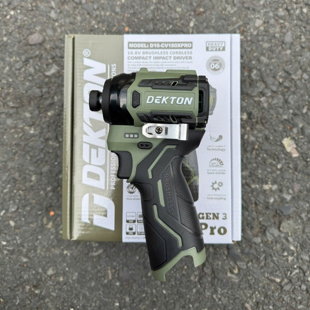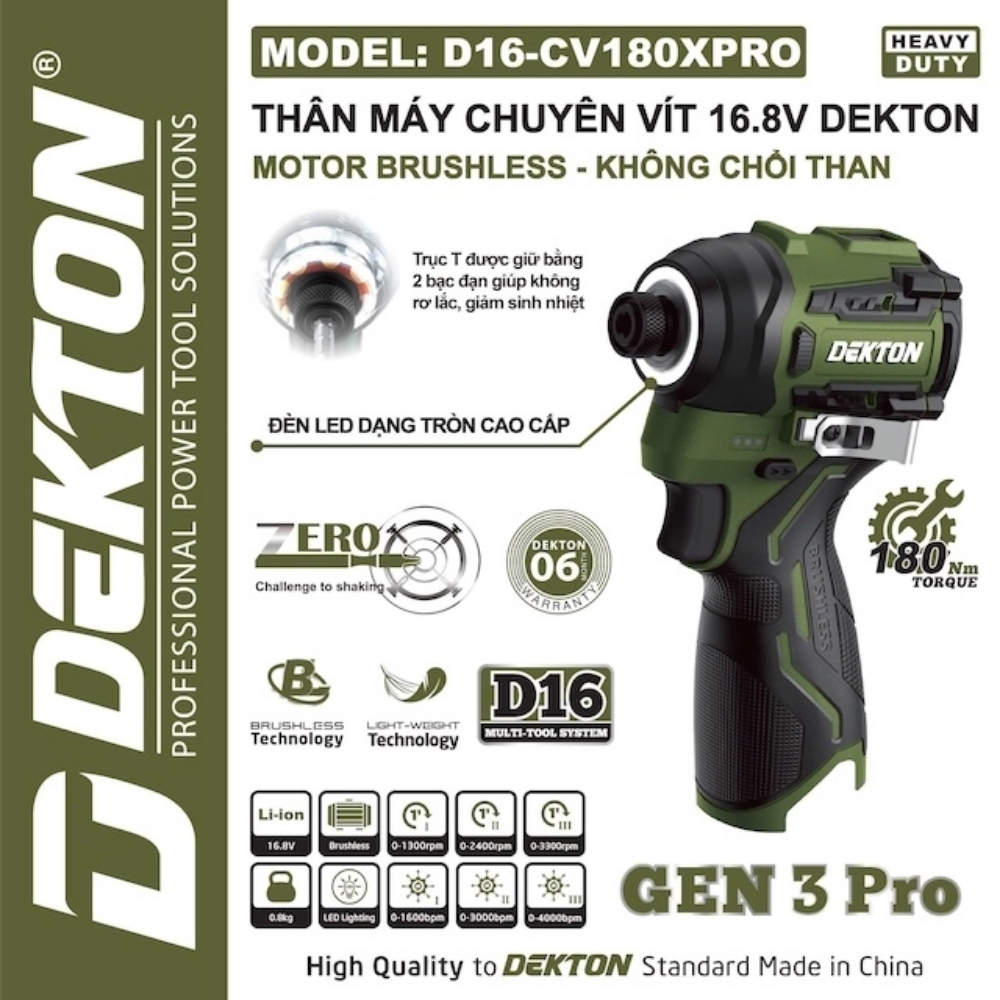 Thân Chuyên Vít 180N.M Đèn Tròn Dekton D16-CV180XPRO là phiên bản với màu sắc đặc trưng của dòng máy siết vít pin 180N.M. Máy vẫn giữ nguyên mô-men xoắn mạnh mẽ 180N.M và thiết kế Đèn tròn, đảm bảo hiệu suất siết chặt cao và khả năng làm việc tốt trong điều kiện thiếu sáng. Thiết kế này hướng đến người dùng yêu thích màu olive nổi bật, nhưng vẫn cần một công cụ siết vít chuyên nghiệp.