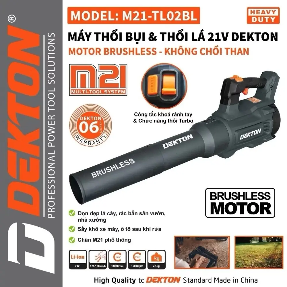 Dekton M21-TL02BL đạt hiệu suất cao với lực thổi 900M3/S và tốc độ tối đa 160000RPM. Chế độ thổi turbo là tính năng quan trọng giúp máy duy trì công suất mạnh mẽ khi cần thiết. Sản phẩm được bảo hành 6 tháng, đảm bảo sự yên tâm khi sử dụng. Thiết kế màu xám mang lại vẻ ngoài cứng cáp, phù hợp với môi trường làm việc công nghiệp hoặc sân vườn. Đây là công cụ không thể thiếu để duy trì sự sạch sẽ và gọn gàng của không gian ngoài trời.