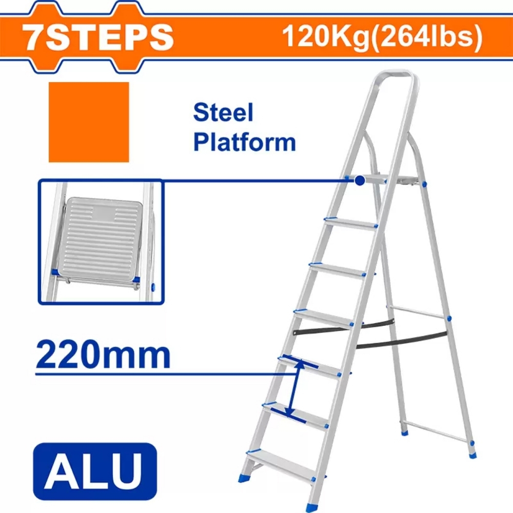 Thang có trọng lượng 4.6kg và vẫn duy trì tải trọng tối đa 120kg (264lbs). Thang ghế gia đình 7 bậc Wadfow WLD3H07 với nền thép trên cùng và tay cầm cao, đảm bảo người dùng có một điểm tựa chắc chắn và không gian đứng an toàn khi làm việc ở độ cao này.