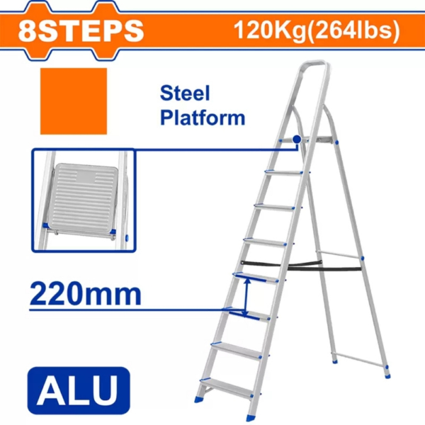 Thang ghế gia đình 8 bậc Wadfow WLD3H08 được chế tạo từ nhôm và thép, có trọng lượng 5.1kg và tải trọng tối đa 120kg (264lbs). Nền thép trên cùng rộng rãi và tay cầm cao 500mm đảm bảo sự an toàn và ổn định khi làm việc ở độ cao này.